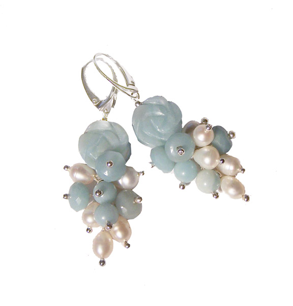 A tutaj amazonit w wersji bardziej ozdobnej. Rzeźbiony na kształt róży, w towarzystwie srebra i perełek hodowlanych.