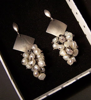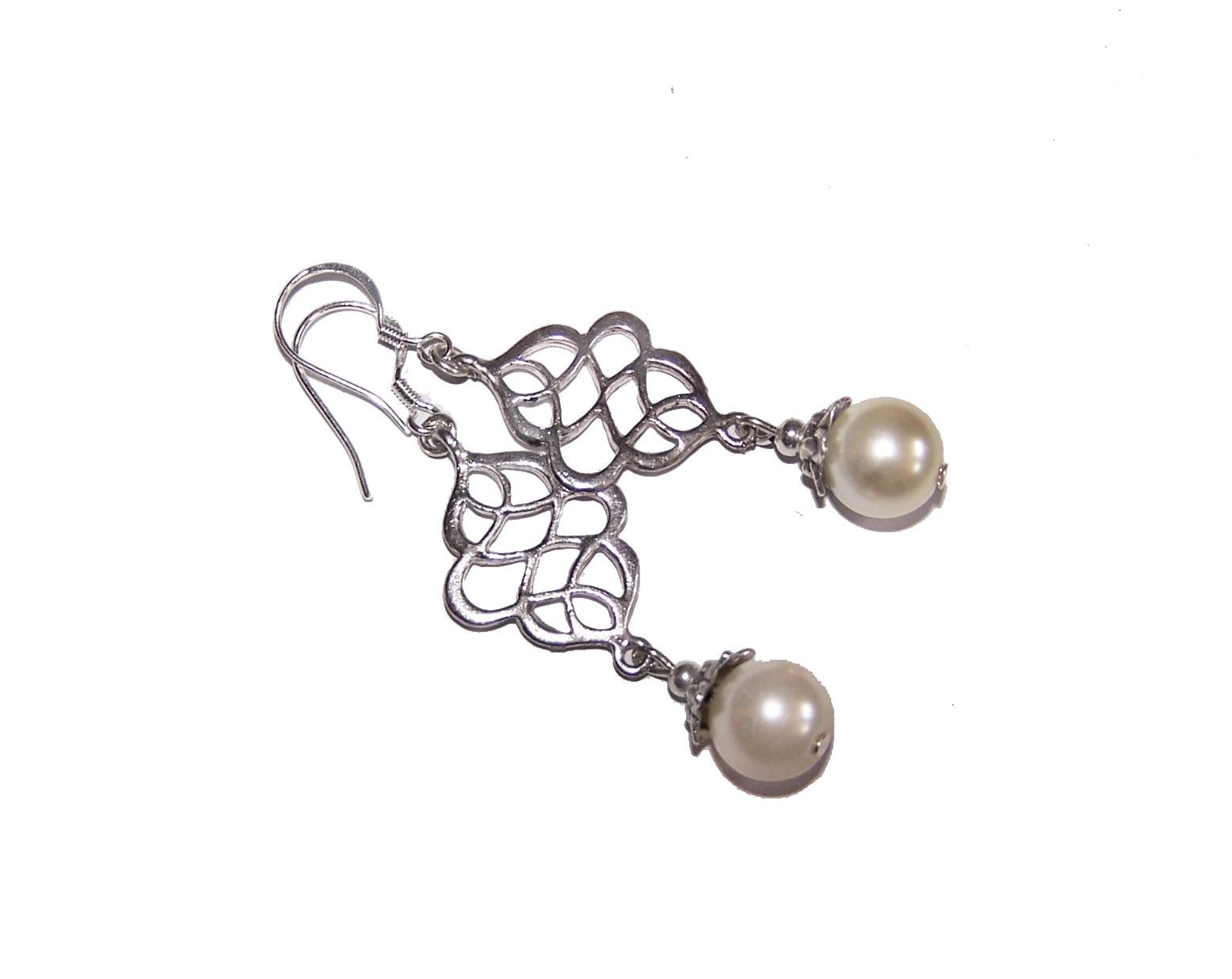 Urocze, lekko romantyczne kolczyki z perełkami, zawieszonymi na ślicznych, koronkowych filigranach. Bigle srebrne.